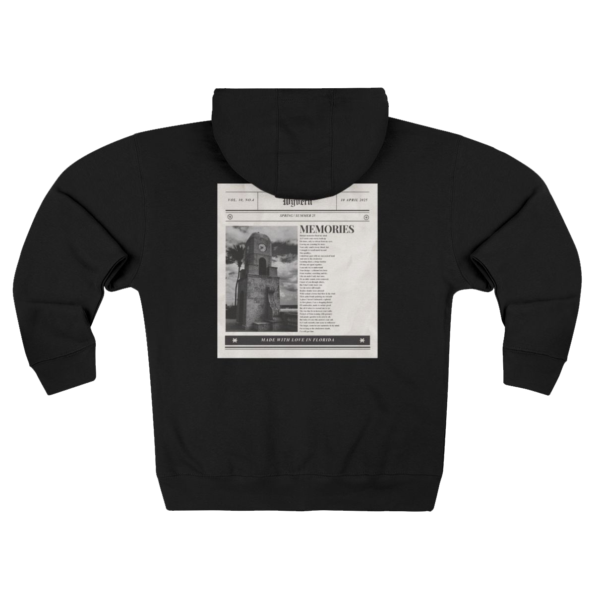 Zip up featuring our newspaper design. This piece has a beautiful backstory and features a poem on the back written by Cole Kaspyrzak.