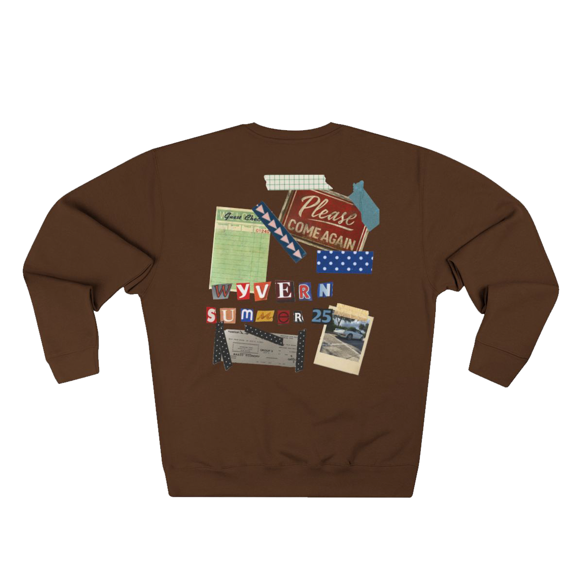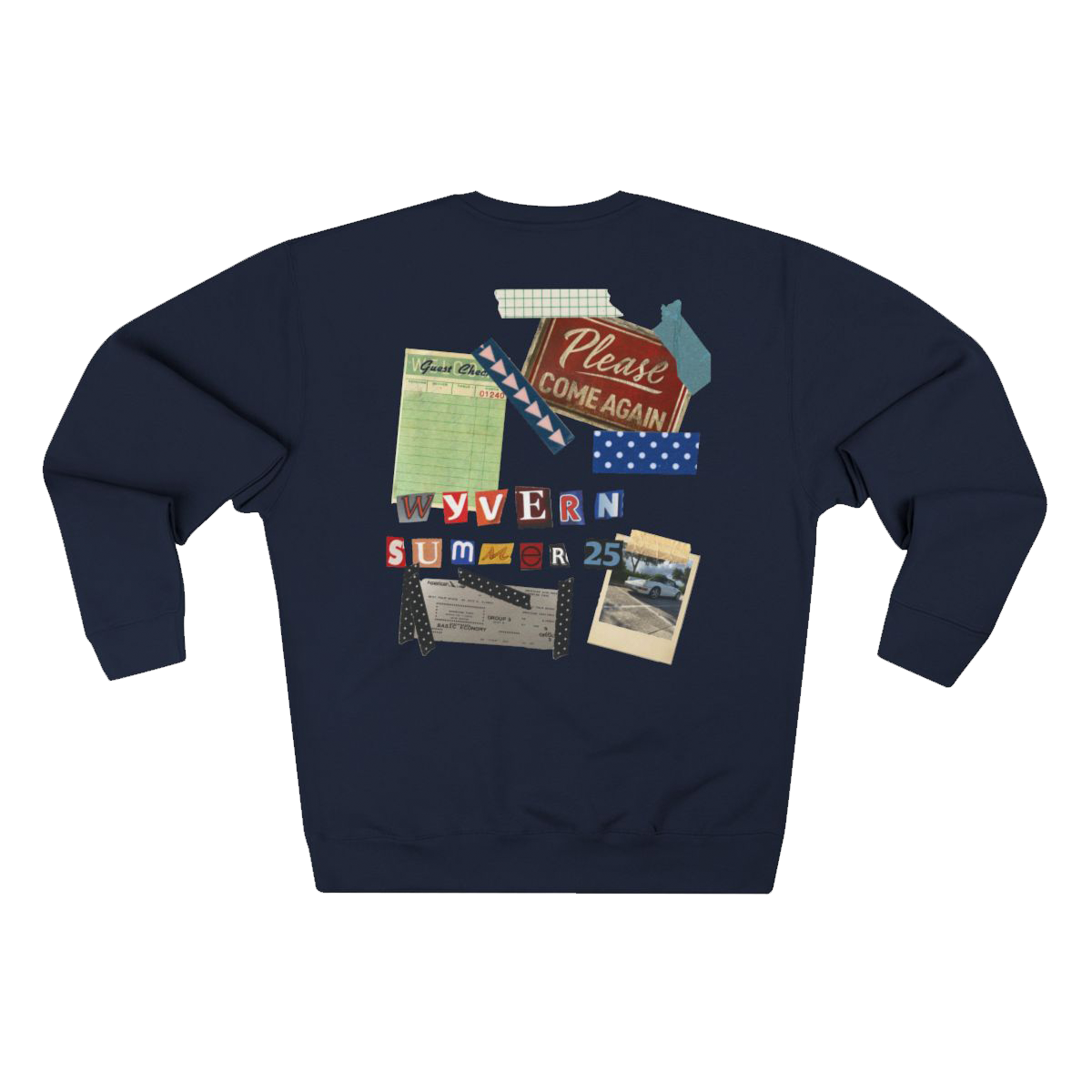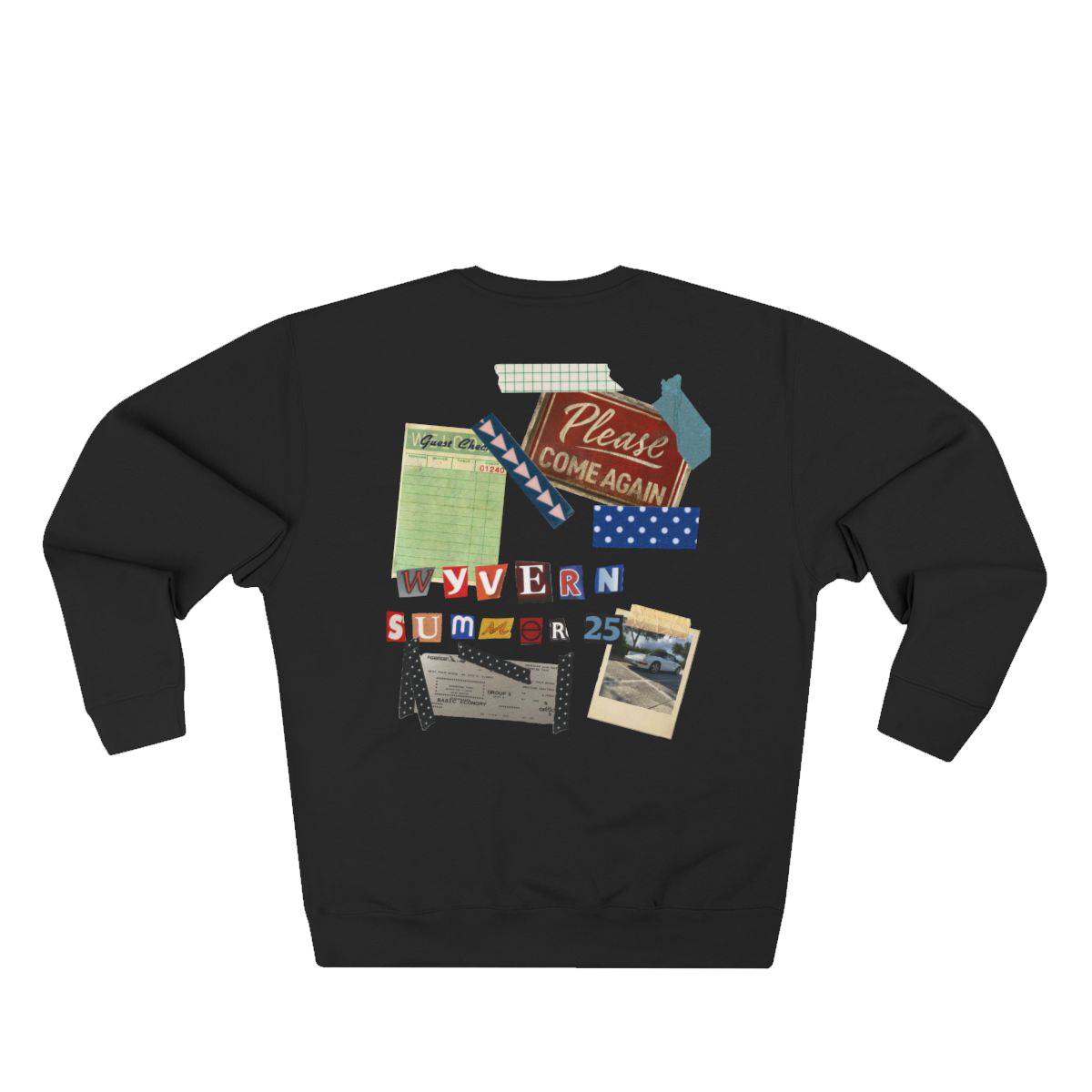 Crewneck featuring our scrapbook design, this design is very personal to me. My original idea was to take photos of some of the main things that inspired me this season and to put them on a crewneck,